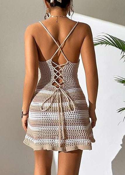 Made from soft and breathable polyester fiber, this dress features openwork knit detailing in a bohemian style. The lace-up back adds a sensual touch and allows for a perfect fit, while the body-hugging cut naturally flatters the curves.
